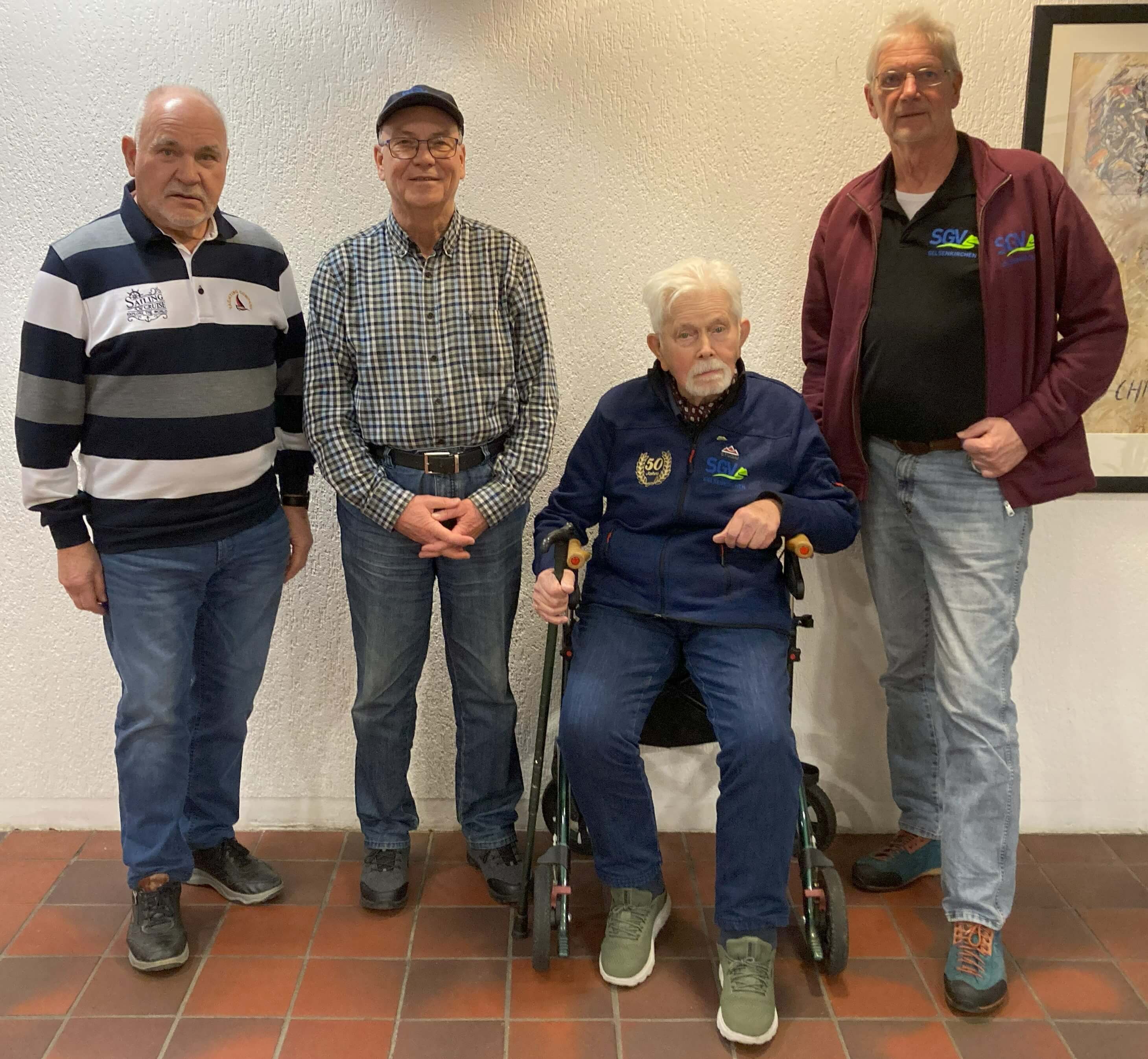 Auf der diesjährigen Jahreshauptversammlung des Sauerländischen Gebirgsvereins (SGV) Abteilung Gelsenkirchenwurde der Kulturwart Werner Neubach (2 v.r.) für seine 50-jährige Vereinsmitgliedschaft sowie die langjährige ehrenamtliche Tätigkeit im Beisein des Bezirksvorsitzenden Emscher-Lippe, Klaus-Dieter Lauterhahn (l.), besonders ausgezeichnet. Bei den Neuwahlen des Vorstandes wurde Werner Neubach für weitere 2 Jahre als Kulturwart wiedergewählt. Dies gilt ebenfalls für den 1. Vorsitzenden Peter Lipinski (r.) und Ute Strauss als Schatzmeisterin.